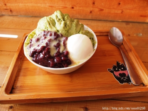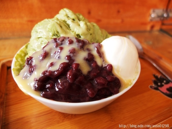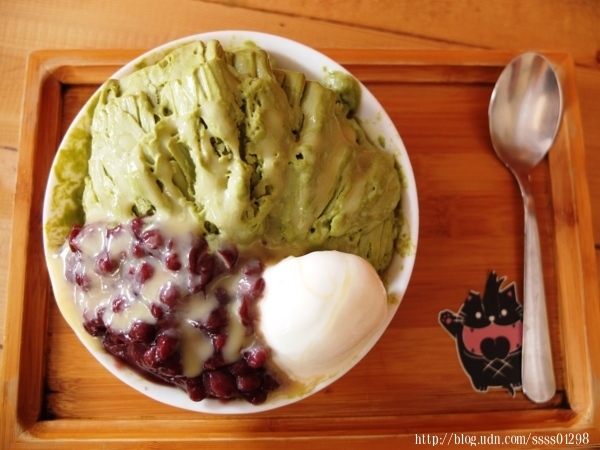 以抹茶雪花冰為基底,搭配綿密香甜的紅豆和香草冰淇淋,豐富度不在話下