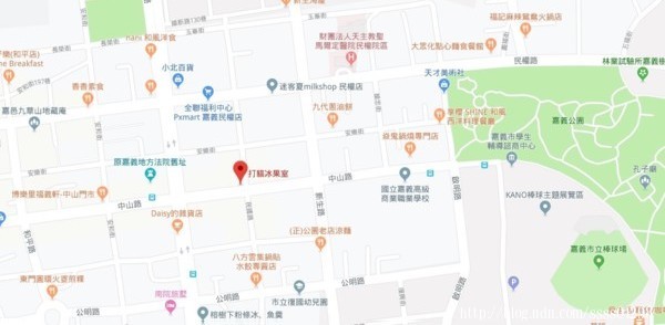 這家「打貓冰果室」位於嘉義市東區中山路和民國路十字路口轉角,清楚好找