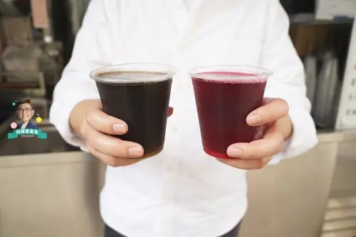 青草茶是用鳥目草、鳳尾草、黃花草、珠仔草和薄荷等熬煮,甜度屬於微甜,喝的時候有股清涼回甘感,味道還不錯。