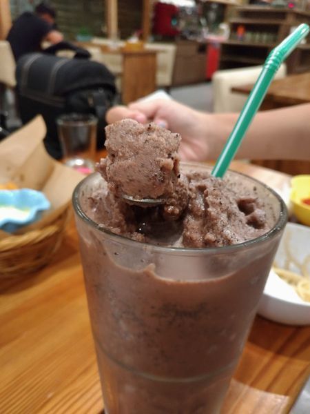 光是這樣子一匙挖起的巧克力冰沙,就整個讓人相當消暑,而且還吃得到 巧克力