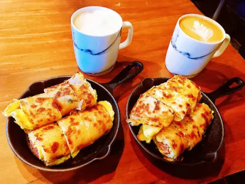 蘑菇歐姆蛋早午餐走一個健康路線,兩片麵包有點嚼勁,熱熱的就蠻好吃的,搭配歐姆蛋滑嫩嫩的,裡面有香濃的起司吃起來更香,一樣有附一杯薯條。