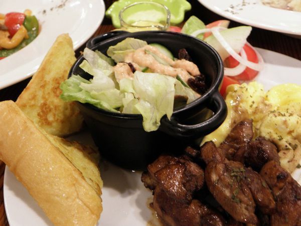 早午餐這樣子相當的豐富,有法國吐司還有 水果及生菜沙拉,另外還有煎蛋及咖啡雞肉