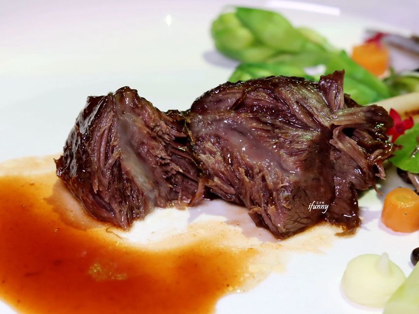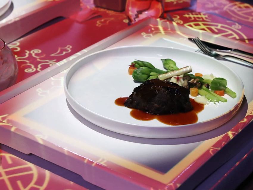 選取澳洲和牛頰部位,以低溫烹調以65度加熱20小時,再以中西合併的方式來演繹。以八角、桂皮、香葉等中式香料慢熬2小時,最後加入老抽、糖、與香菜梗提味的中式醬汁,令這和牛頰增添了東方神秘的滋味。