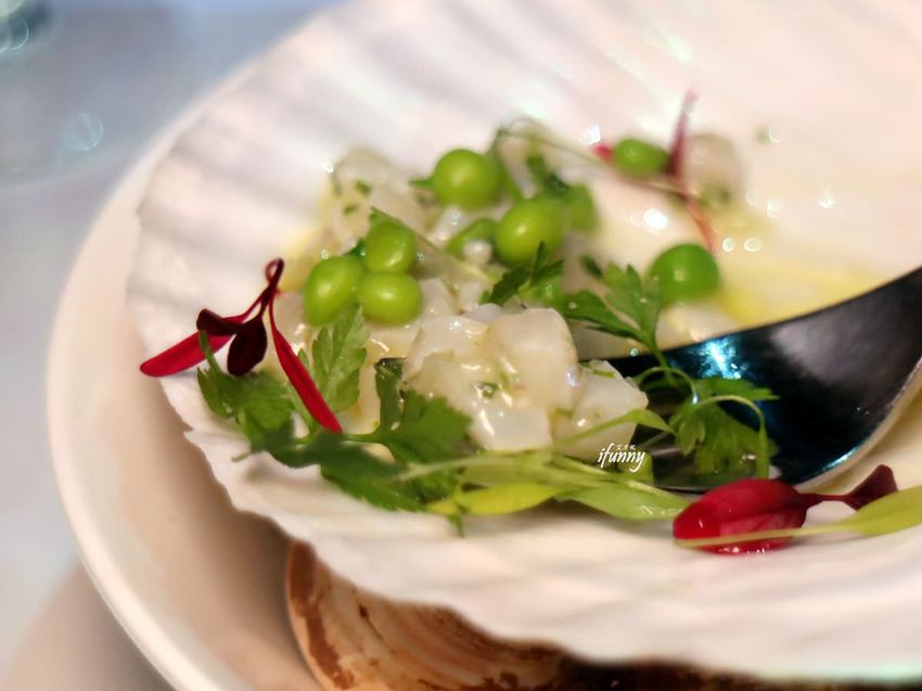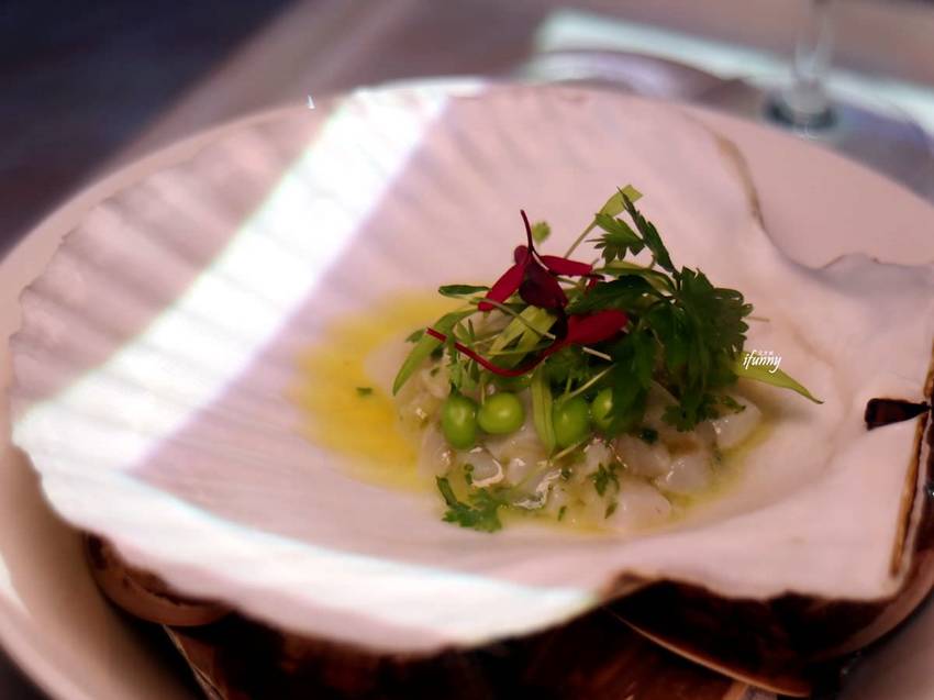 北海道干貝切成小丁,加入蝦夷蔥、紅蔥頭以及橄欖油及檸檬汁調味。有別於大口吃干貝,這道干貝味道特別地細緻,值得慢慢回味!