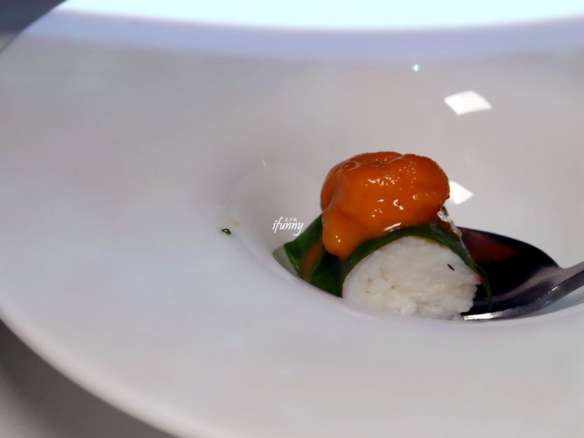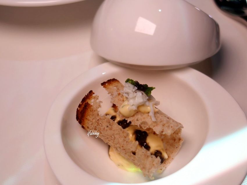 自製的麵包卷中填入了酸奶,再大方綴上魚子醬,薄脆的麵包口感,加上酸奶的濕潤及魚子醬的鹹香,創造出入口的奢華感及層次上的驚喜。