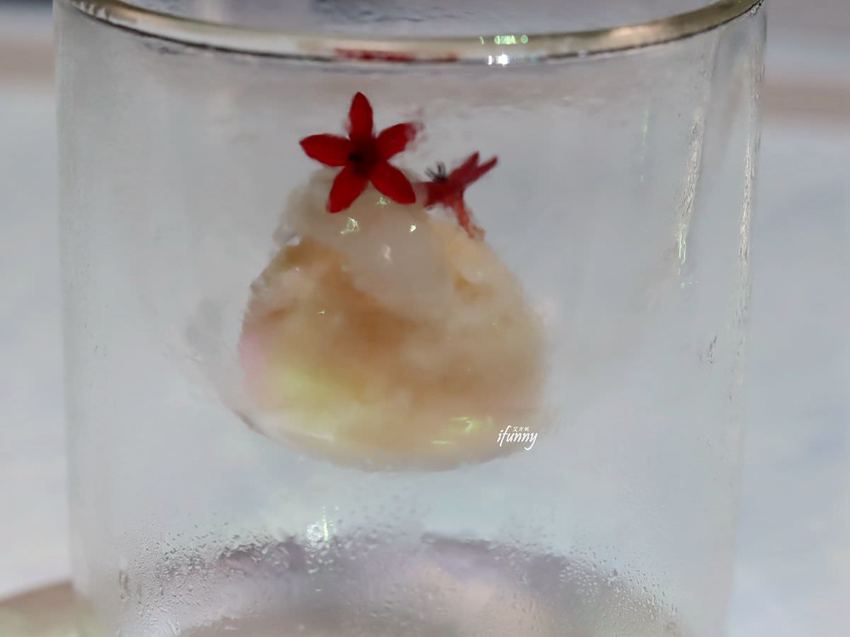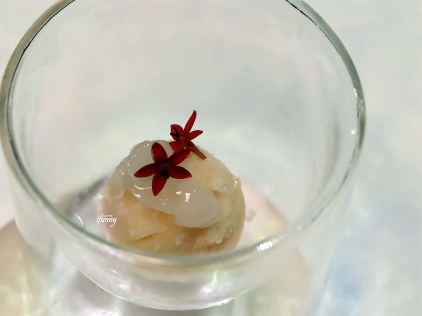 這仙氣十足的小點,是由點心主廚在萃取的烏龍茶湯中放入新鮮檸檬切片,浸置一晚,再加入冰糖將其製成沙碧。再搭配產量稀少、富含膠原蛋白的雪蓮子,加入冰糖熬煮成微甜圓潤的口感。經由這清爽宜人的滋味,來清理口中的味道,接著要準備享受主餐了!
