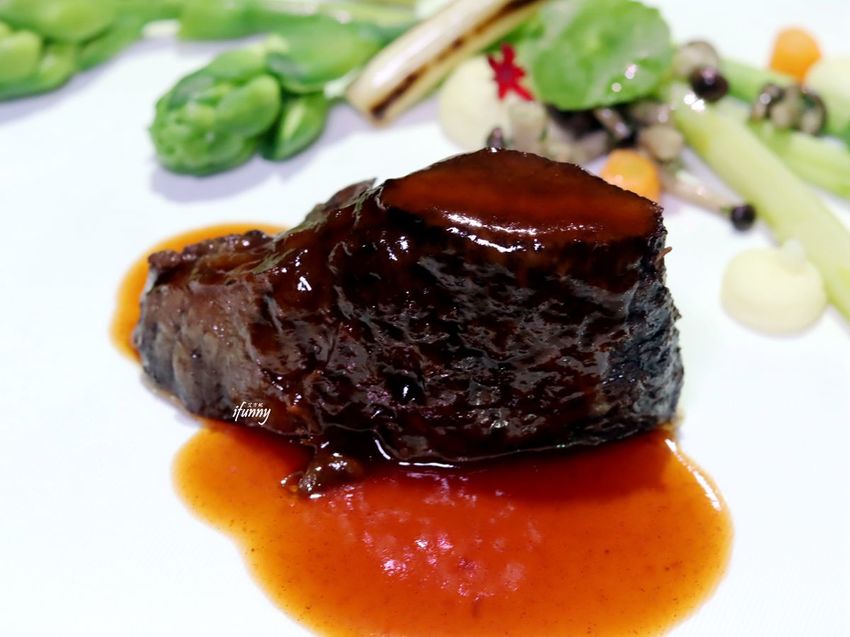 這舒肥過的和牛頰軟嫩無比,刀子不需費力即可輕易分離,筋肉部份都滲入了迷人的醬香。東西組合的特殊滋味,沒有一點違和感,卻令人傾心不已,幾乎每個人對於這個在味蕾中綻放的美味都讚嘆聲不斷!就連一旁盤飾的晚香玉筍等蔬菜,都是恰到好處的搭配。
