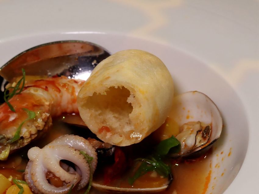 以蕃茄及蔬果為底的湯頭,喝起來微酸帶甜,並融入了海鮮的濃郁海味,那樣的甜美不可言喻!再以空心的麵包沾附湯汁,一點湯汁都不想浪費!