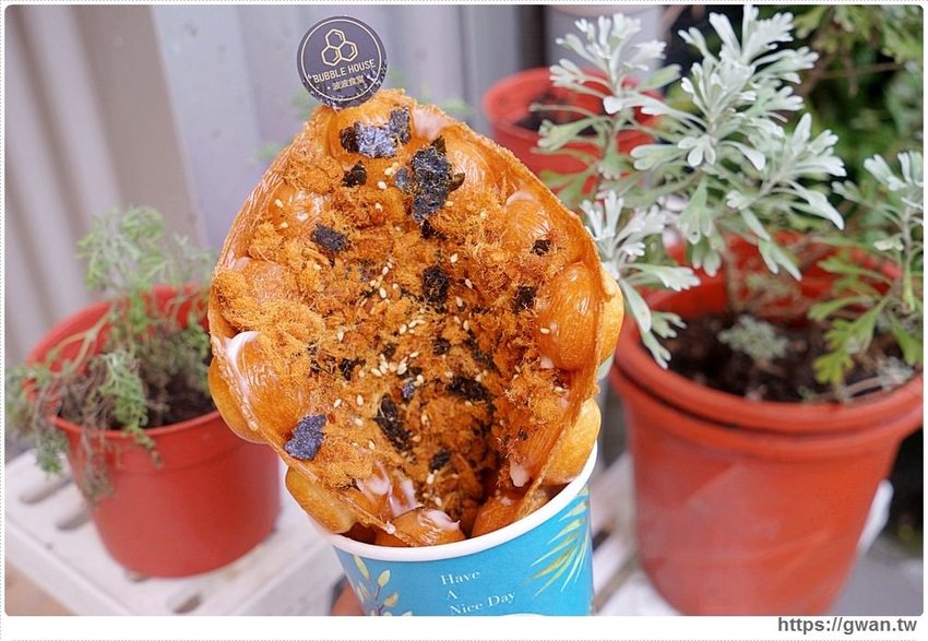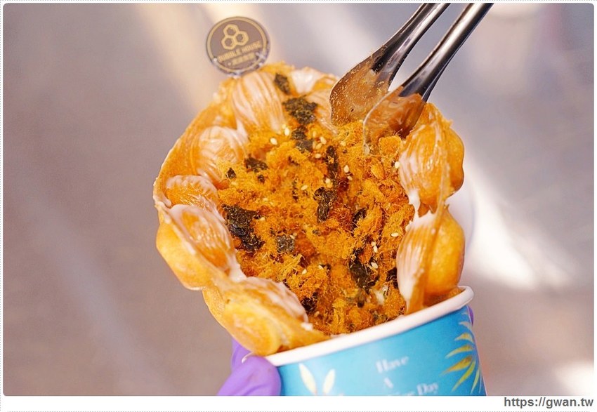 是說這個口味很有趣,外表是港式雞蛋仔~吃進嘴裡卻變成小時後常吃的肉鬆沙拉麵包,味道真的很懷舊!酥脆肉鬆綴上海苔香,下午時間真是一大享受