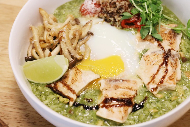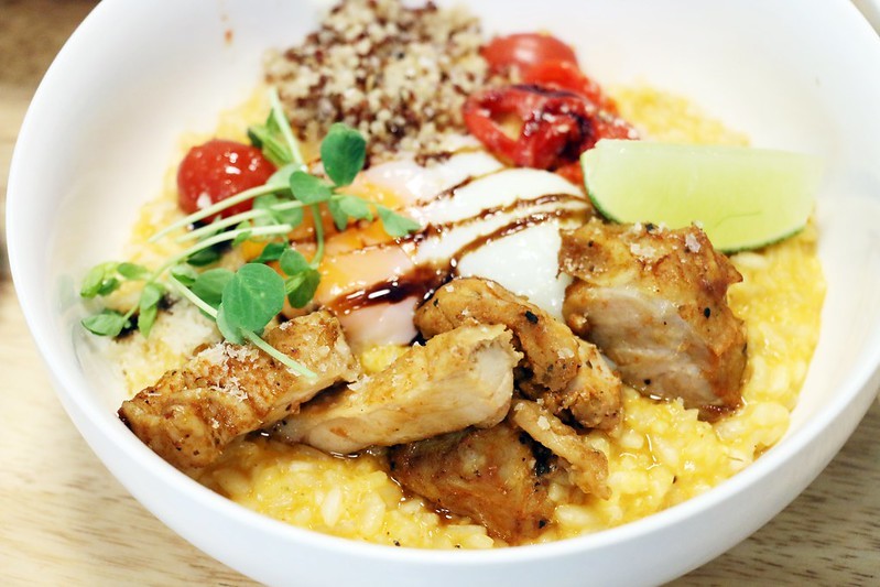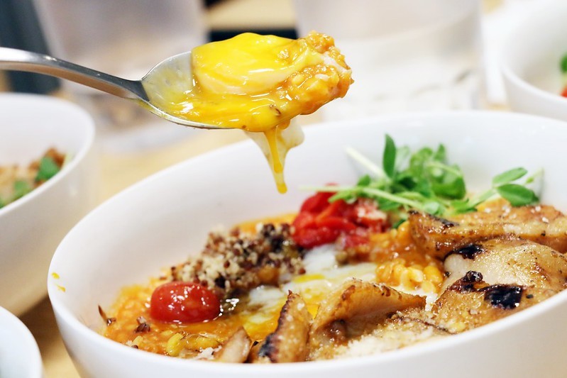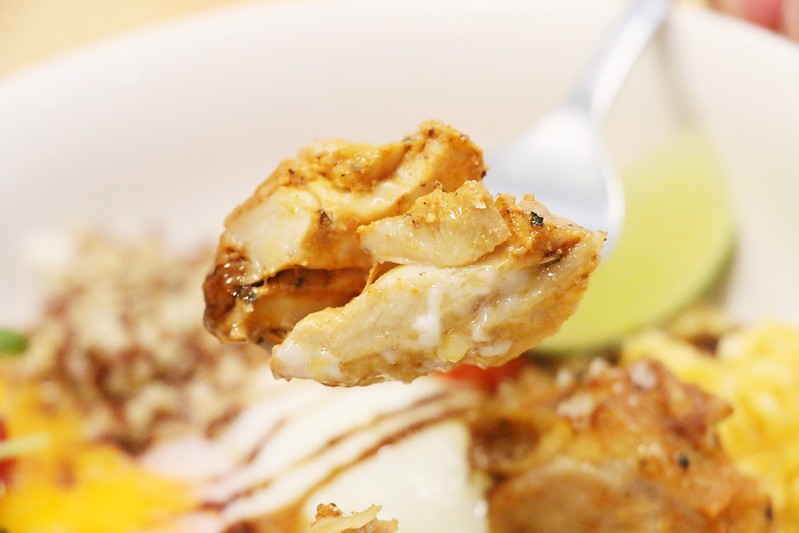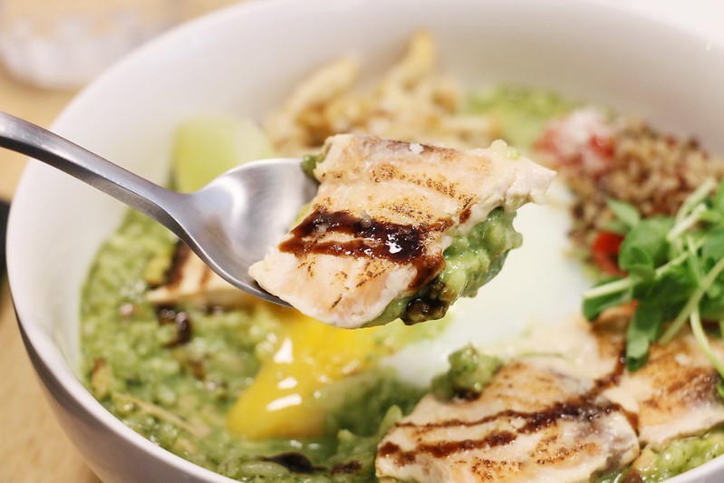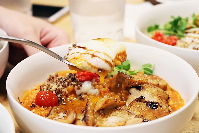 配料是雞肉、番茄、藜麥、半熟蛋、豆苗