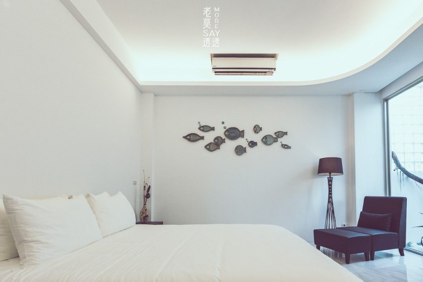 一進門往左邊走是主臥室,有1張加大的雙人床、58吋大電視以及一張單人座沙發,打開檯燈,可坐在上頭閱讀書籍,享受片刻的寧靜。