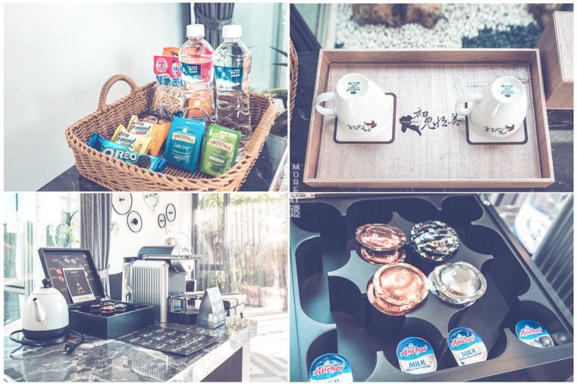 吧台上頭有義式膠囊咖啡機、熱水壺、瓶裝水、小點心與唐寧茶包。