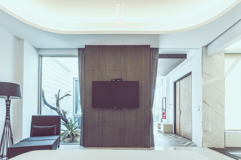 客廳右手邊有張L型三人座貴妃沙發,還有一個黑色球形吊椅。兩面都是大型的落地窗,南國的夕陽斜射在這讓人想慵懶的Villa,而窗外便是獨棟的專屬泳池。