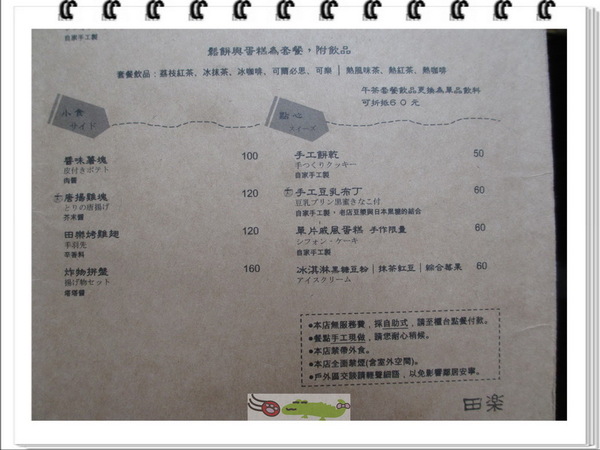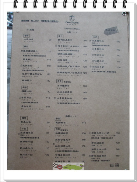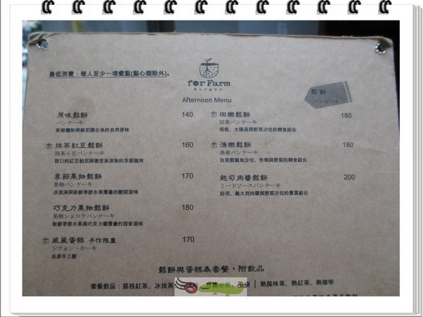 菜單相當簡單的一張紙,餐點都不算貴,價格還蠻適中的。如果點午茶套餐換其它飲料的話可以折抵60元。不過有一人一定要點飲料的低消(不過小食和點心類的不算喔!),所以我們點了兩份套餐「田樂鬆餅套餐」和「戚風蛋糕套餐」(飲料則換成「熱抹茶牛奶」),以及季節限定的「梅子蕃茄汁」,和「新鮮奇異果汁」。