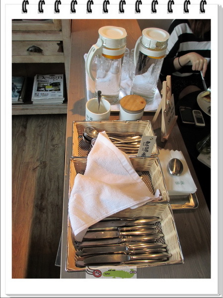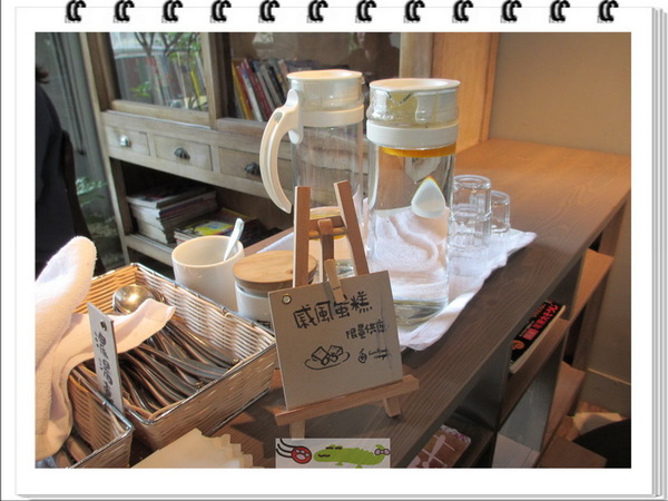 自助式的消費,所以也不收取服務費,倒水和餐具都是自取的!大水壺中放了兩片大柳橙,相當的可愛呀!還有版子寫著「戚風蛋糕」限量供應!好有FU~