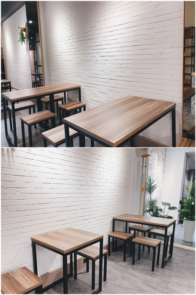 白色的牆面加上木質桌椅,再加上一些綠色植物點綴