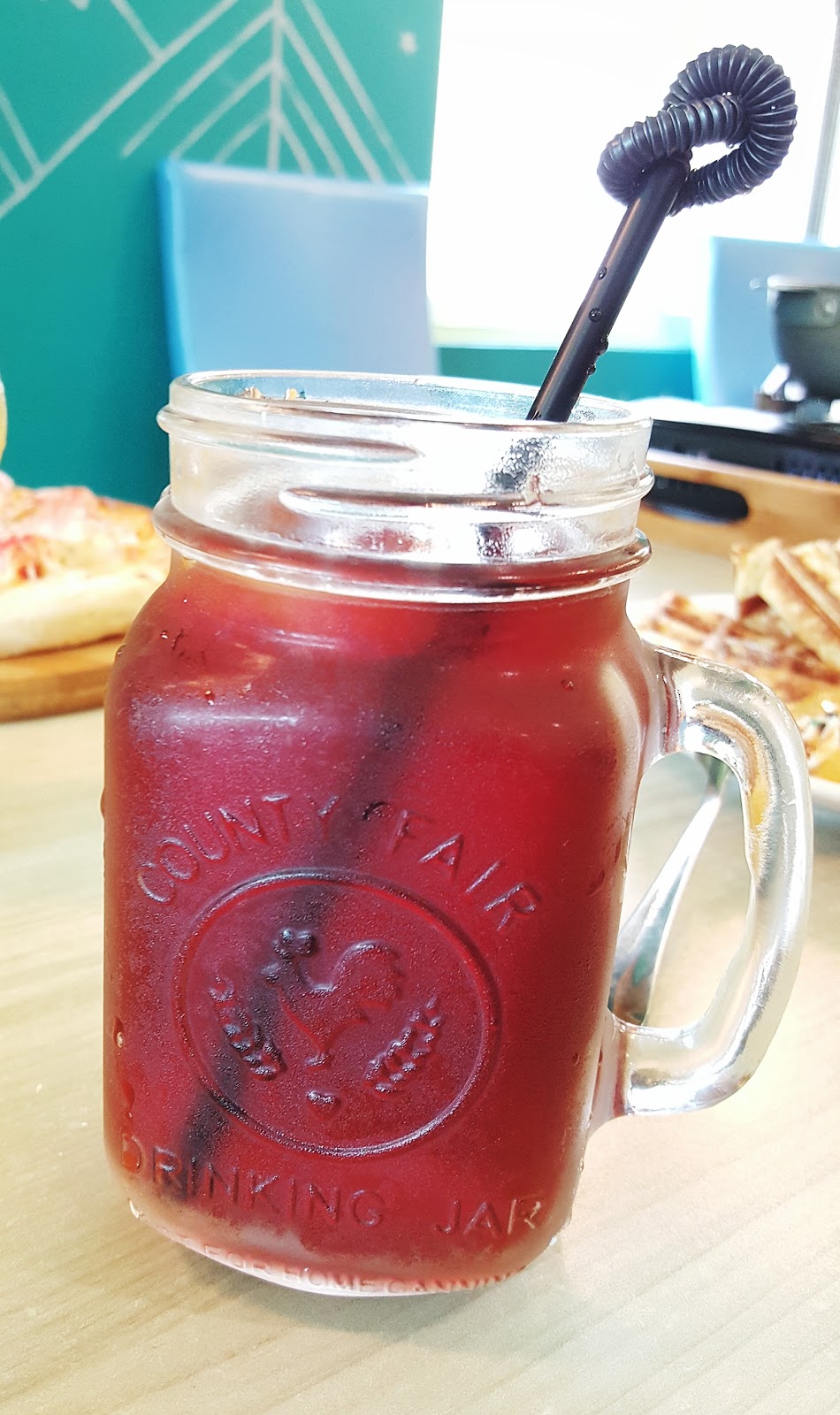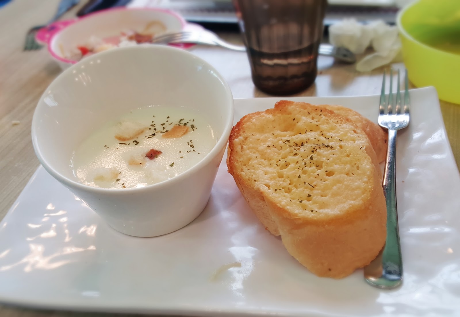 套餐附的紅茶。女兒不知道是第一次看到捲起來的吸管還是看到玻璃杯,覺得很新奇討著要喝,但是茶類有咖啡因小孩好像比較不適合,於是我們把飲料倒出裝入白開水,讓她用捲捲吸管喝水。