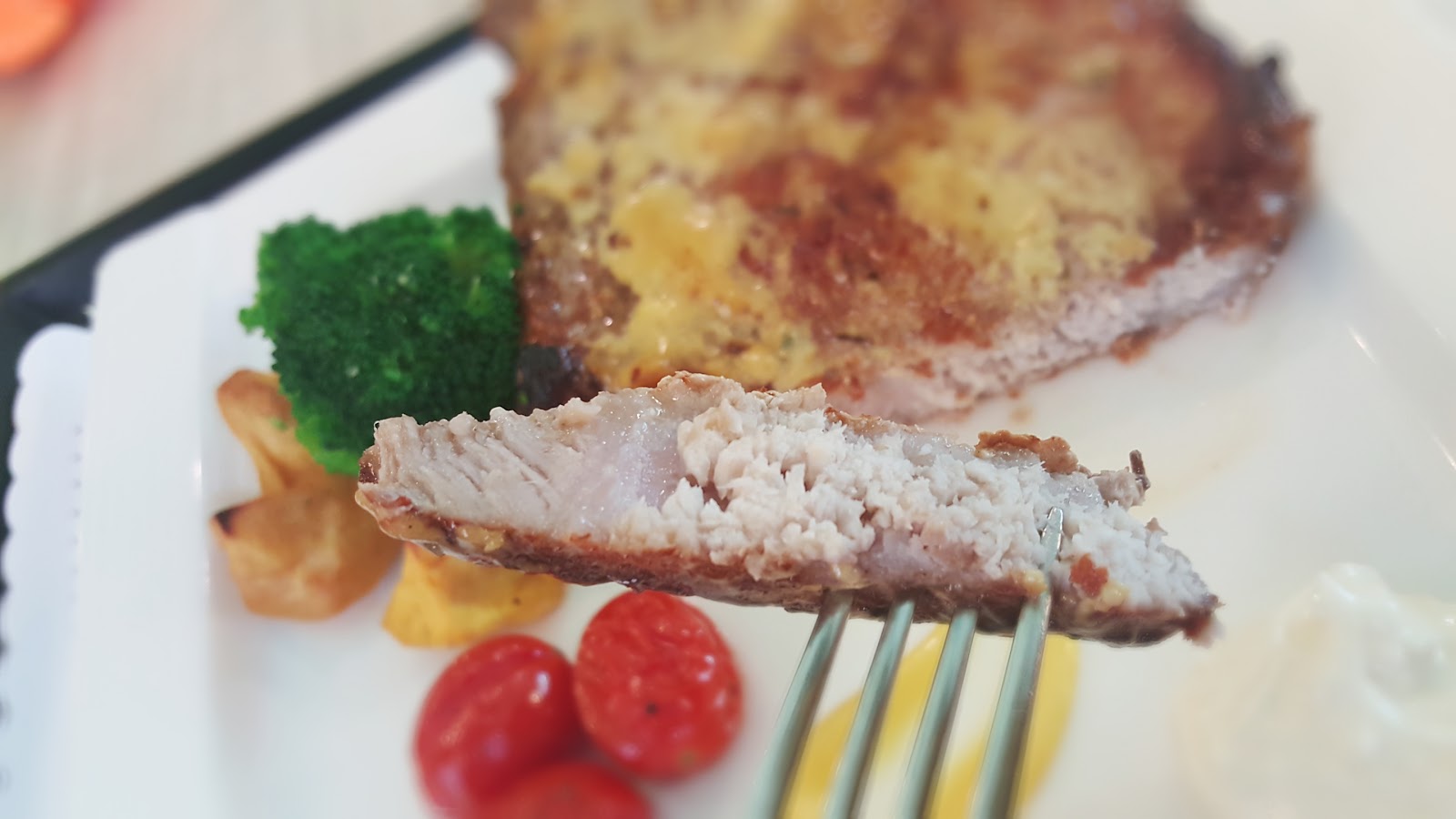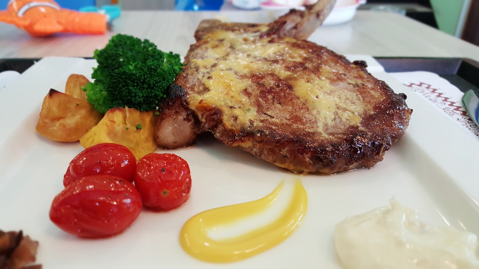 本來想點到底是多精彩絕倫的海陸對戰套餐,給女兒吃點魚排,結果剛好沒有了,店家推薦我們改點勇士戰斧豬排。擔心豬排會不會太硬,結果完全不會,切小塊給女兒,她很買單。