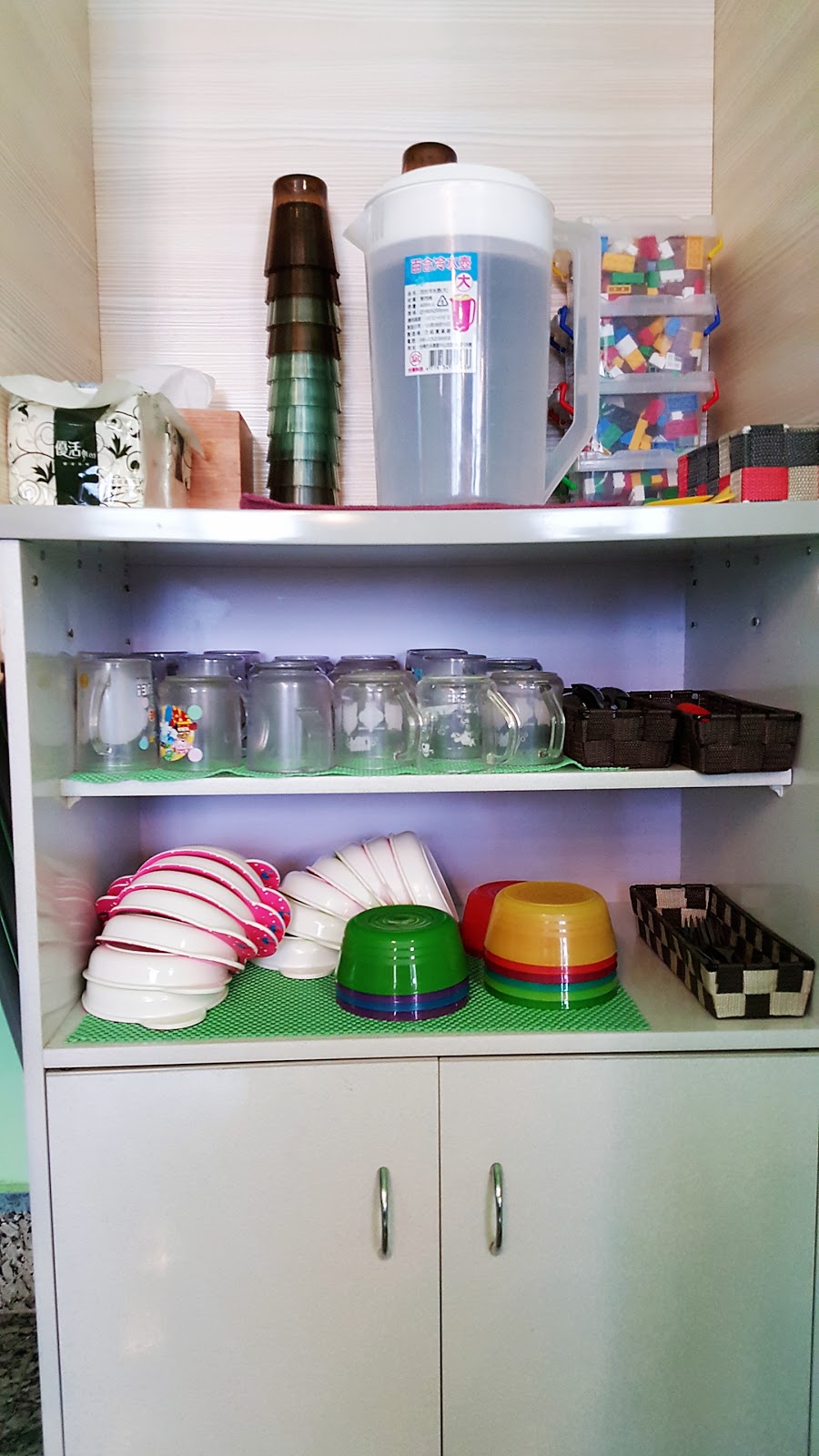 除了大人小孩的餐具之外,我發現有個設計很貼心:在水壺旁有幾盒樂高。為什麼玩具會放在餐具區而不是遊戲區呢?小小孩一開始學習吃飯的時候能專心的時間不長,一盒小積木可以讓爸媽稍微轉移孩子的注意力,讓孩子能在餐椅上多待一會兒囉!