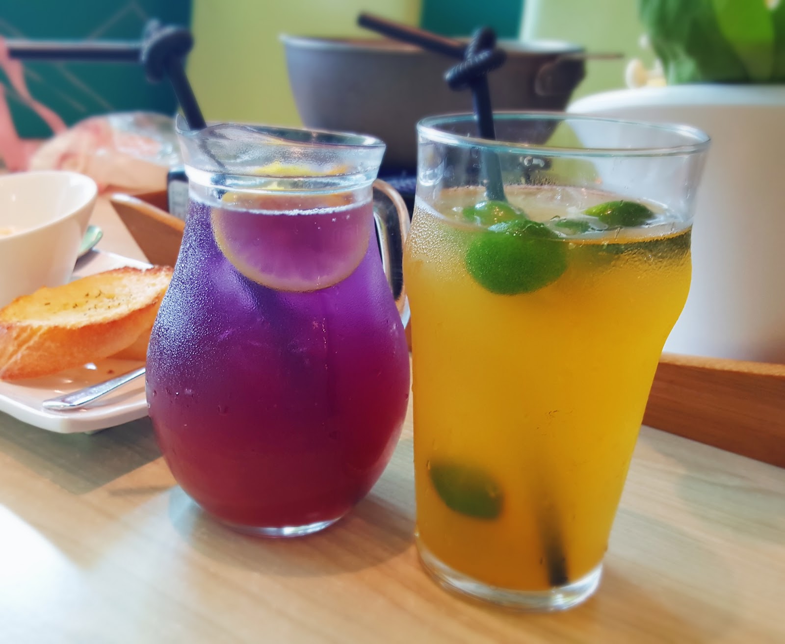 特色飲品蝶豆花特調漸層飲料,蝶豆花含有豐富花青素,繽紛的色彩也很吸引孩子目光。