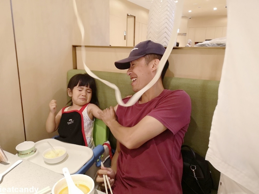 終於!為甚麼小肥肉會哭呢?因為師父撈麵啦!這個撈麵秀必須有點撈麵才能看到!師傅真的很厲害,都能把麵甩到靠近小肥肉不到五公分,小肥肉一開始只是緊盯著看,後來就大哭了~因為…..她叫師傅去甩爸爸,師傅不理她 XDDD
