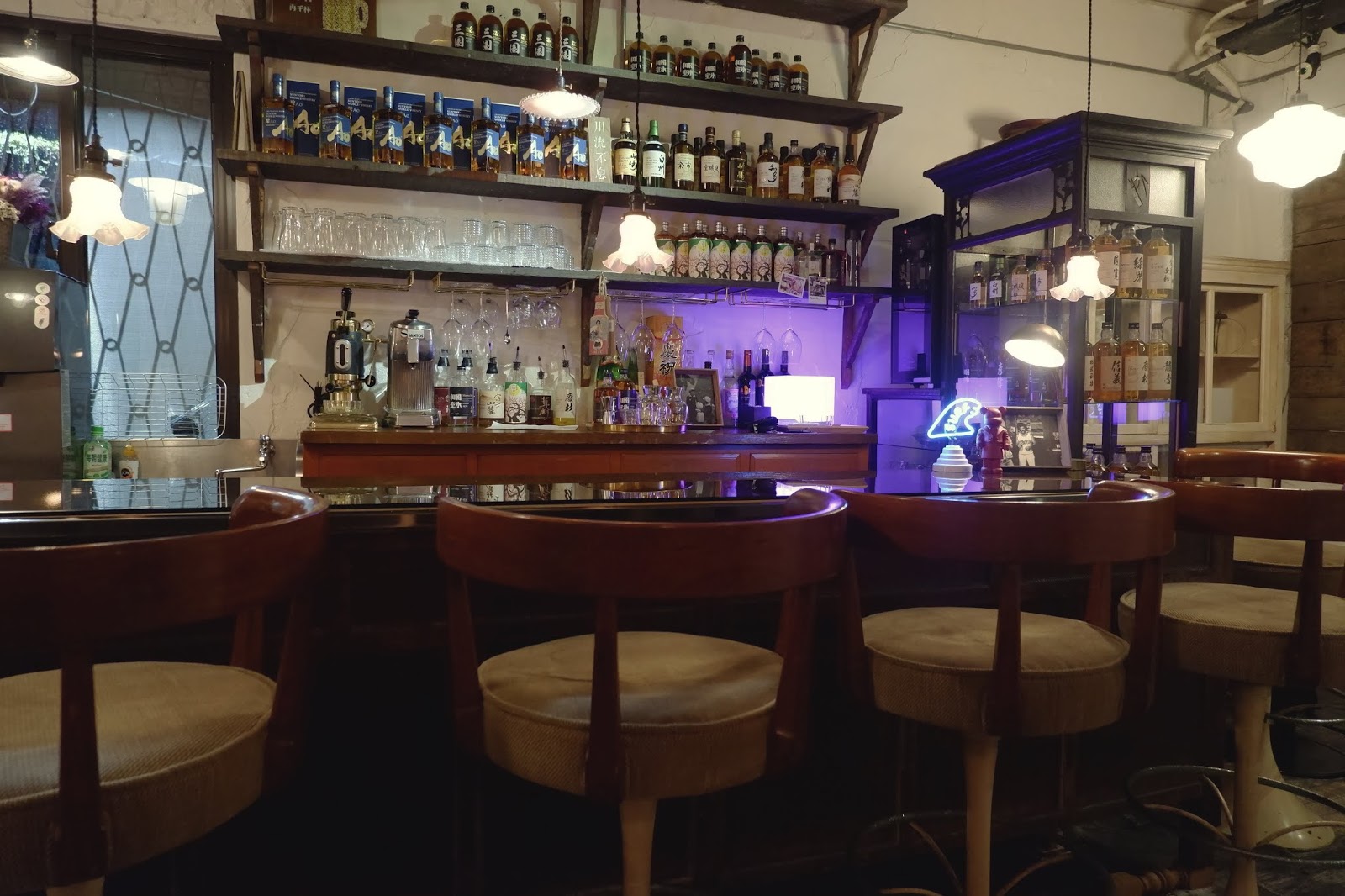 店內以供應日本威士忌純飲為主,富士山麓、山崎、宮城峽等,再輔以日本梅酒、啤酒等多種酒品可選擇,最特別的則是客製化酒標被擺放老舊物件的櫃子裡,現代新潮的標籤文字反而增添了這善意揶揄的趣味性。