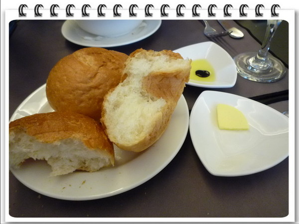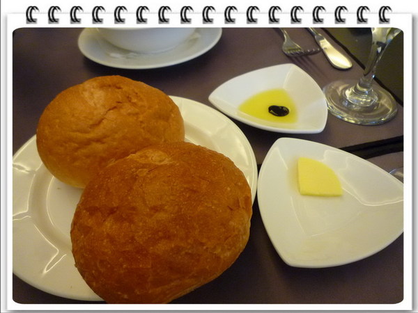 「法式圓麵包」提供油醋及奶油醬,麵包外酥內軟,一剝外皮就碎滿桌,蠻好吃的,不愧是法式餐廳。