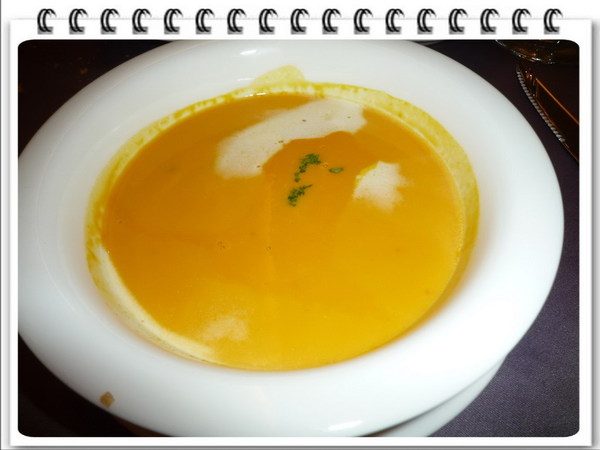 前菜「香煎鮑魚佐珍珠薏仁燴雞汁」(法式料理的名稱真的都相當長呀,不過好處是寫的一目了然,寫食記都不用擔心會漏掉東西~XD),這一道我喜歡~鮑魚鮮嫩可口,配上杏胞菇及薏仁,清爽又有豐富滋味,不愧為店內招牌前菜。