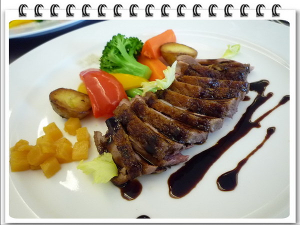 噹噹~終於上主菜了,這是「香煎櫻桃鴨胸襯薑味糖漬鳳梨」,一上菜就讓人覺得份量滿點!!已經先幫我們切成一片片方面食用,總共有10片,鴨胸肉新鮮軟嫩,搭配的醬汁恰到好處不會蓋過鴨胸的味道,配菜的馬鈴薯蔬菜及糖漬鳳梨更有畫龍點睛的效果。