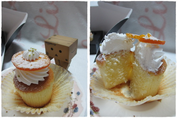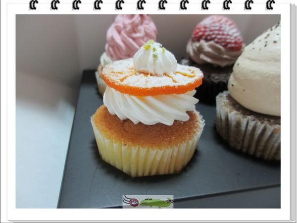 這是「陽光香橙」(65元),口味上算是比較清爽的,下面的杯子蛋糕味道一般,沒有什麼香橙的味道。本來以為柳橙味道會很重,不過重的只有上面奶油中間的那一片柳橙片,有糖漬過味道還不錯,奶油部分也還好。只有最上面的那一小團有一些柳橙皮的碎片讓整體有香味,味道一般般。