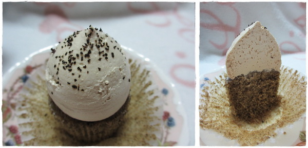 這個的話,上面巧克力奶油跟下面的巧克力戚風蛋糕比起來,甜度稍微低一些,不過整體來說還算是蠻甜的一個杯子蛋糕。
