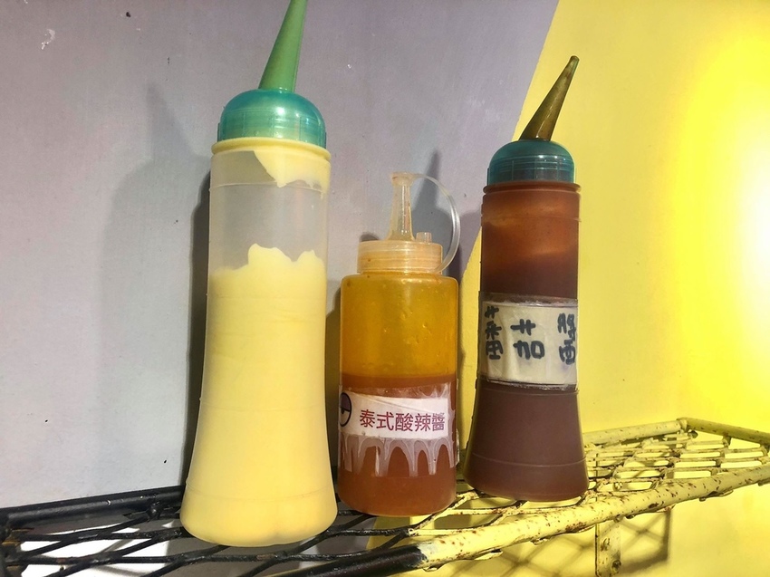 有三種沾醬可以搭配:黃芥末、番茄醬、泰式酸辣醬