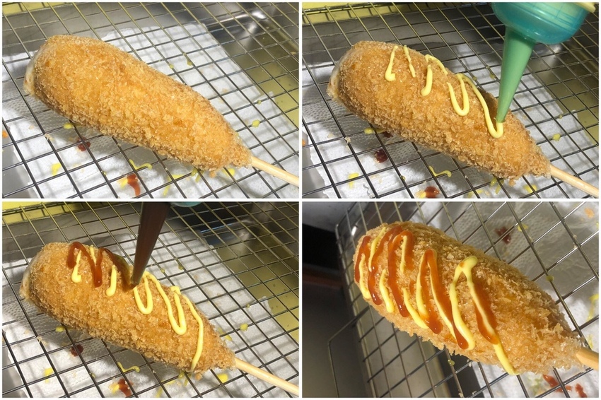趁剛出爐的熱狗還熱騰騰的時候到旁邊小平台淋沾醬
