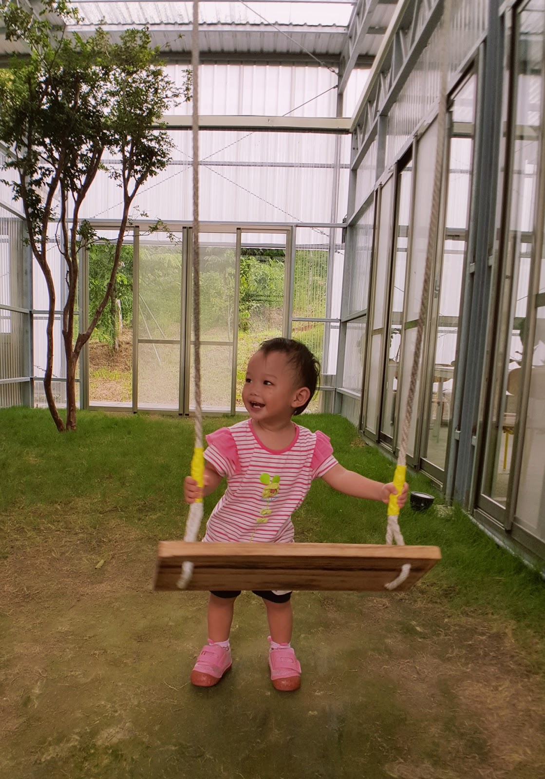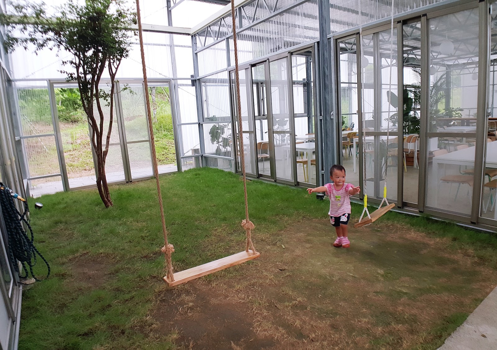 在咖啡廳和餐廳中間設置了兩個鞦韆,上方有屋頂,下雨天也可以玩。陽光從窗戶灑進來,光影錯落交織,覺得歲月靜好。