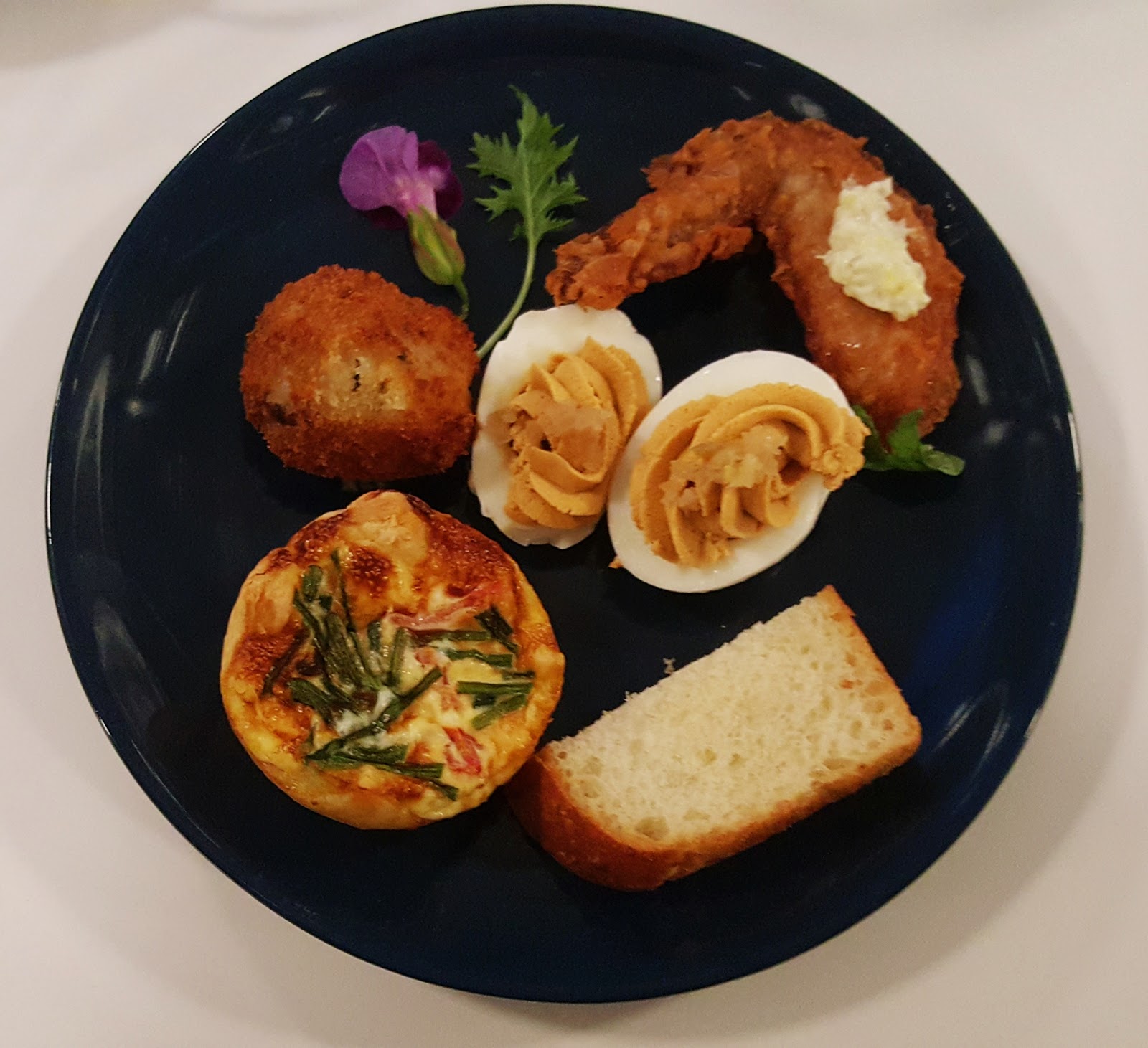 美濃特產野蓮再度出現,下午茶是加入司康和可頌,晚餐裡做成鹹食,類似蛋塔的作法加入野蓮和番茄,剛出爐熱騰騰的飄著蛋香,非常好吃。