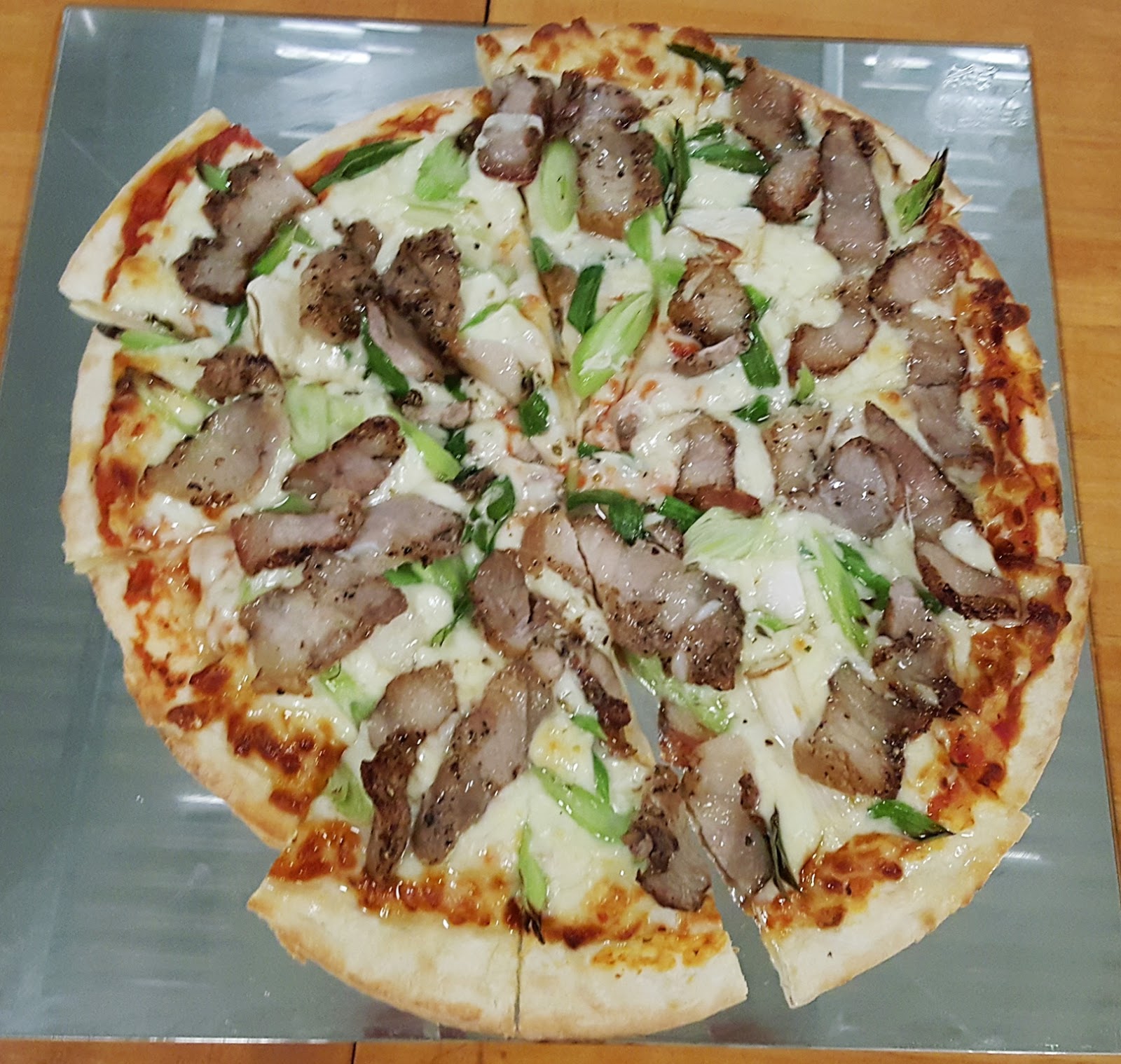 鹹豬肉披薩是今天我心中的 TOP 1,餅皮薄脆,鹹豬肉和起司的組合第一次吃到,意外的合拍,青蒜苗畫龍點睛,讓披薩吃起來齒頰留香。