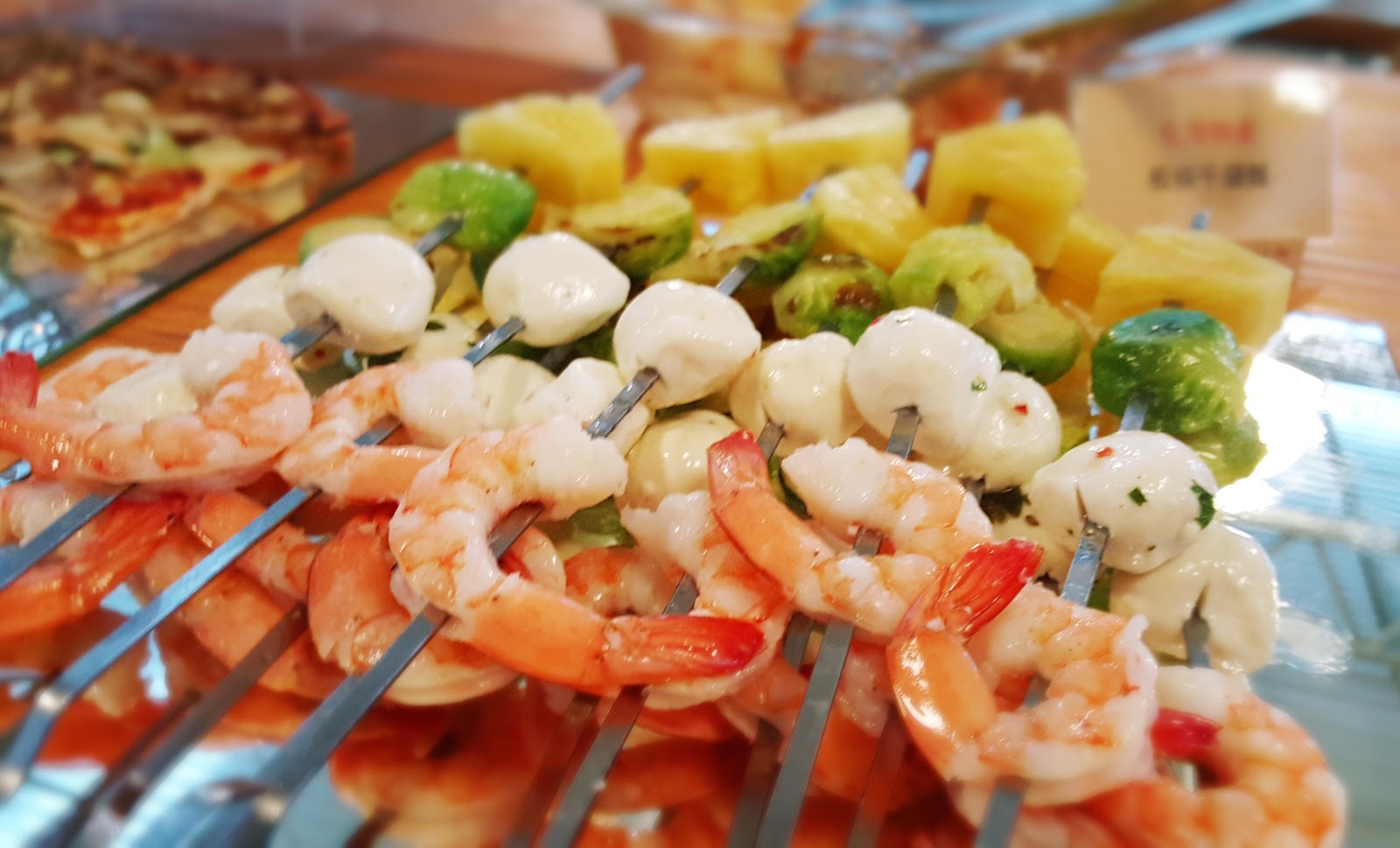 這道菜色彩鮮豔,小孩一見就搶著要。上面有鳳梨、甘藍、起司和鮮蝦,全部都是女兒喜歡的食材,一整串拿著啃,作為開胃菜也很稱職喔!