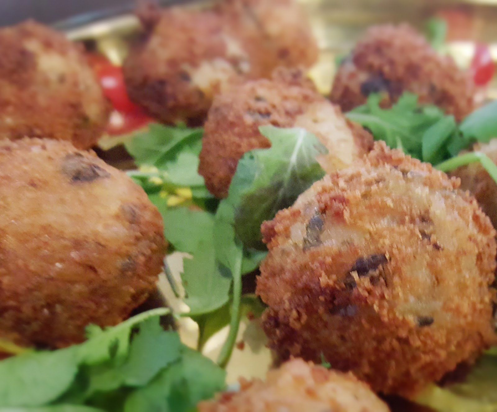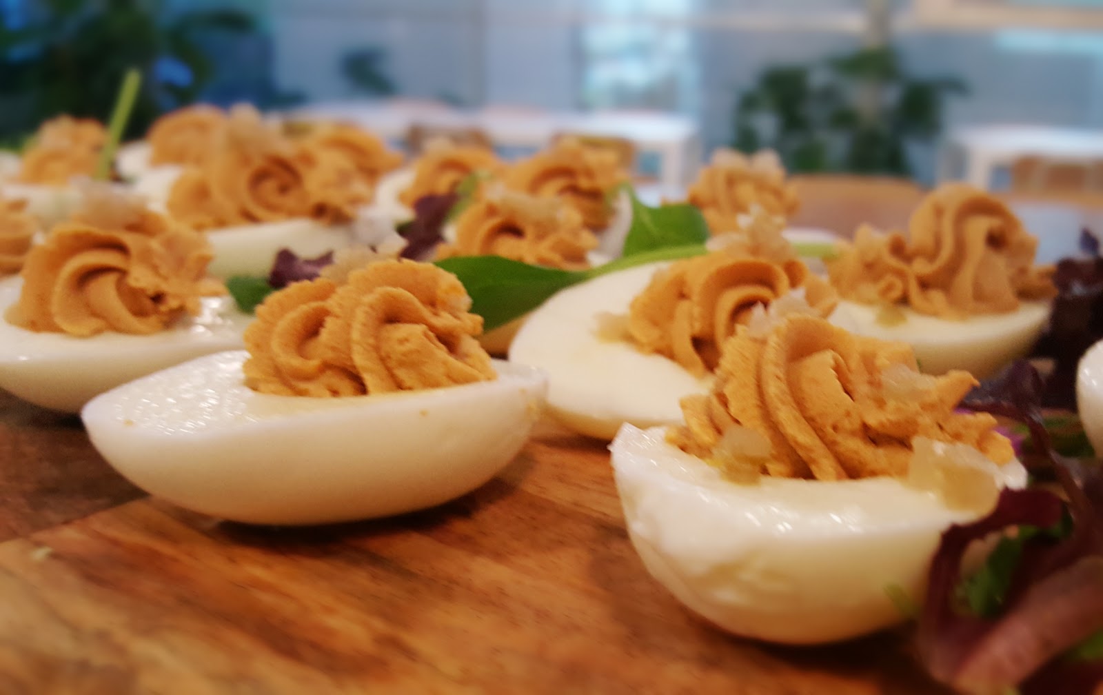 主要食材是美濃147米和客家梅干菜,梅干菜不是只能做梅干扣肉,白米還能用燉飯球這樣的形式入菜。平常吃膩白飯的女兒,看上去像炸丸子的燉飯球竟也乖乖吃掉一兩顆。想讓小小孩在餐椅上多坐一會兒,媽媽的廚藝還得精進啊! 酸菜惡魔蛋
