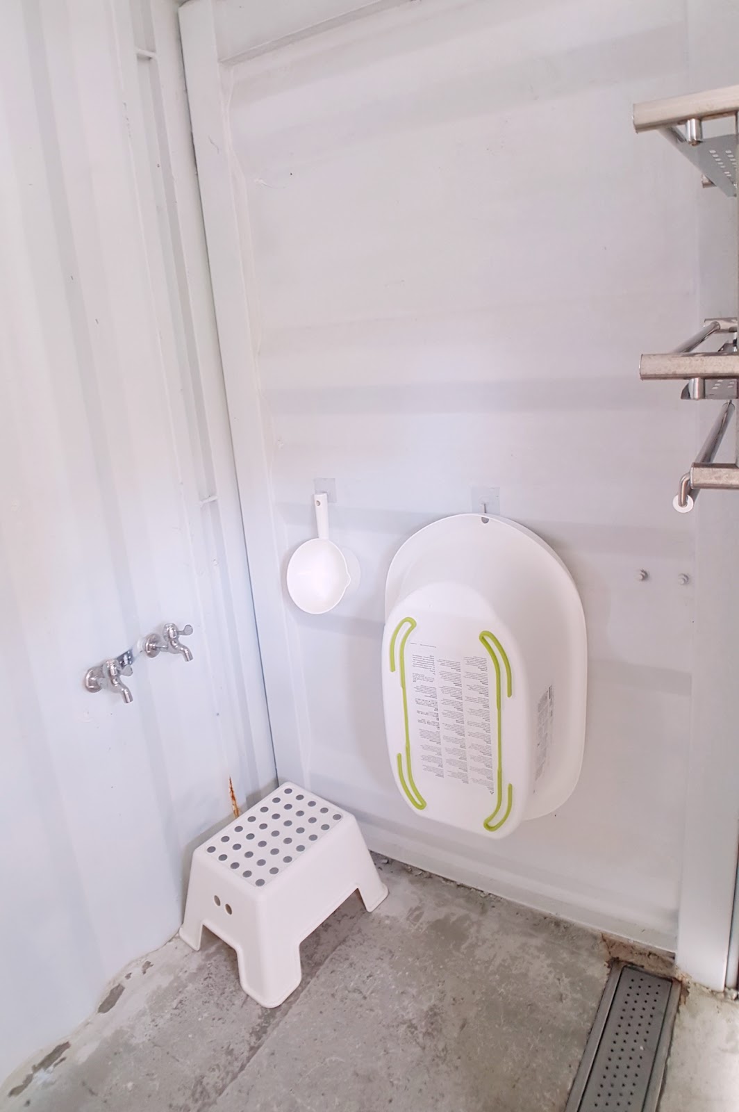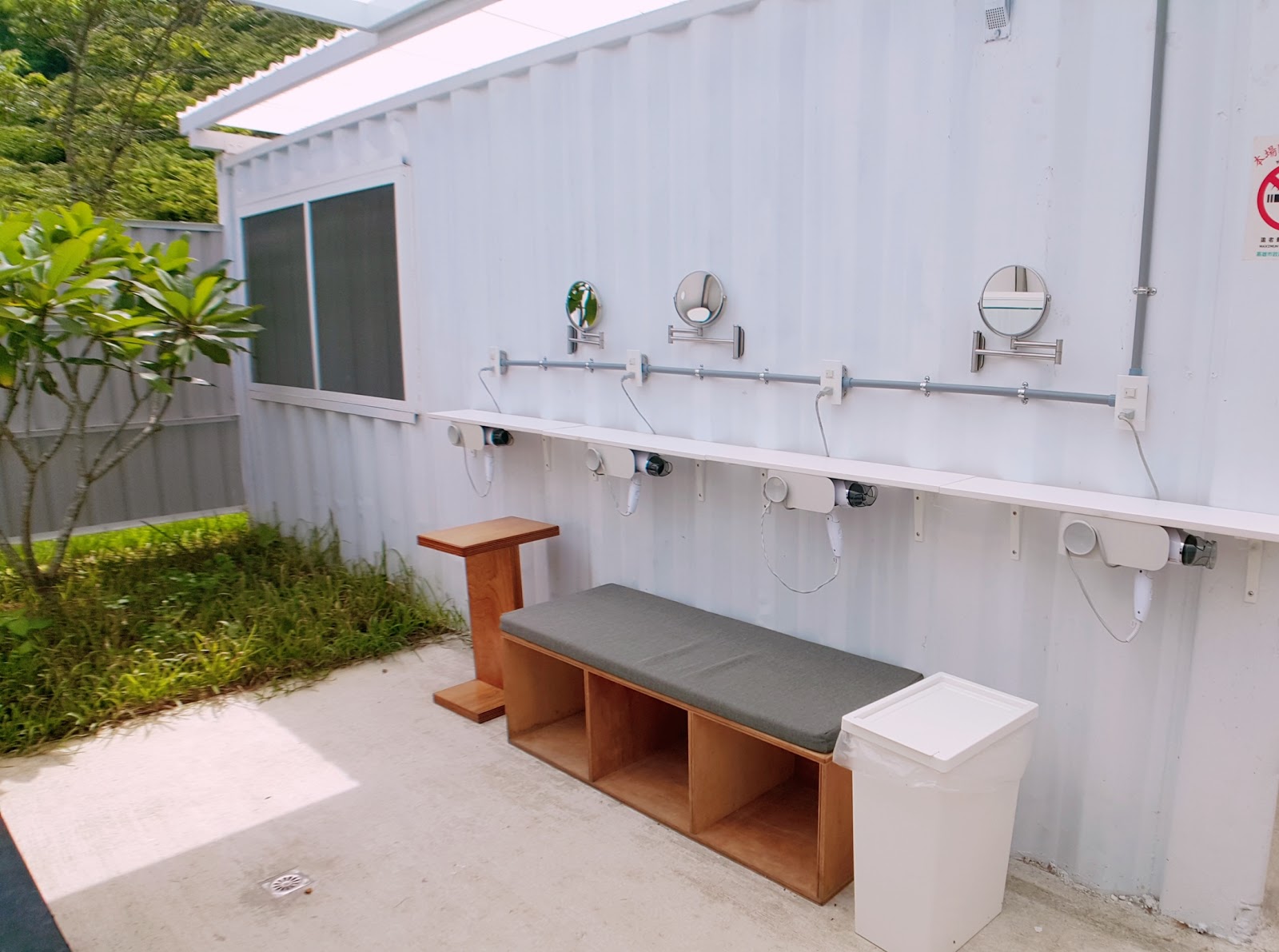 澡堂的設計相當親子友善,我們到訪這兩天,看到好幾個帶著兩歲以下小小孩的家庭,貼心的設計讓爸媽享受露營也能輕鬆照顧孩子。男女澡堂在入口處分開,一起來看一下環境吧!