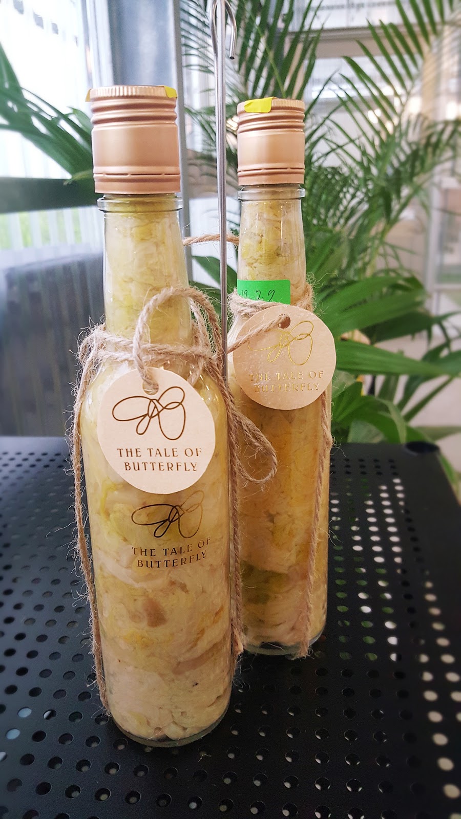 完成後用蓋子密封,用麻繩製作提把方便攜帶,儲存一個月後可以開瓶享用。蝶舞澗設計的瓶子看上去很有質感,將高麗菜乾取出吃完後,還可以用來做花瓶裝飾唷!