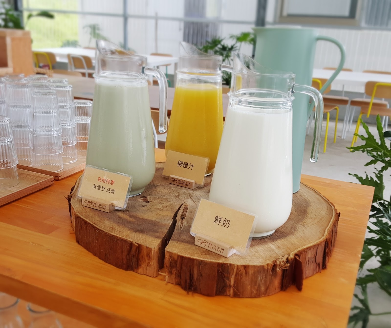 飲料有鮮奶、柳橙汁、熱咖啡和美濃黑豆漿。連黑豆漿用的黑豆也是在美濃培育的有機青豆仁喔!