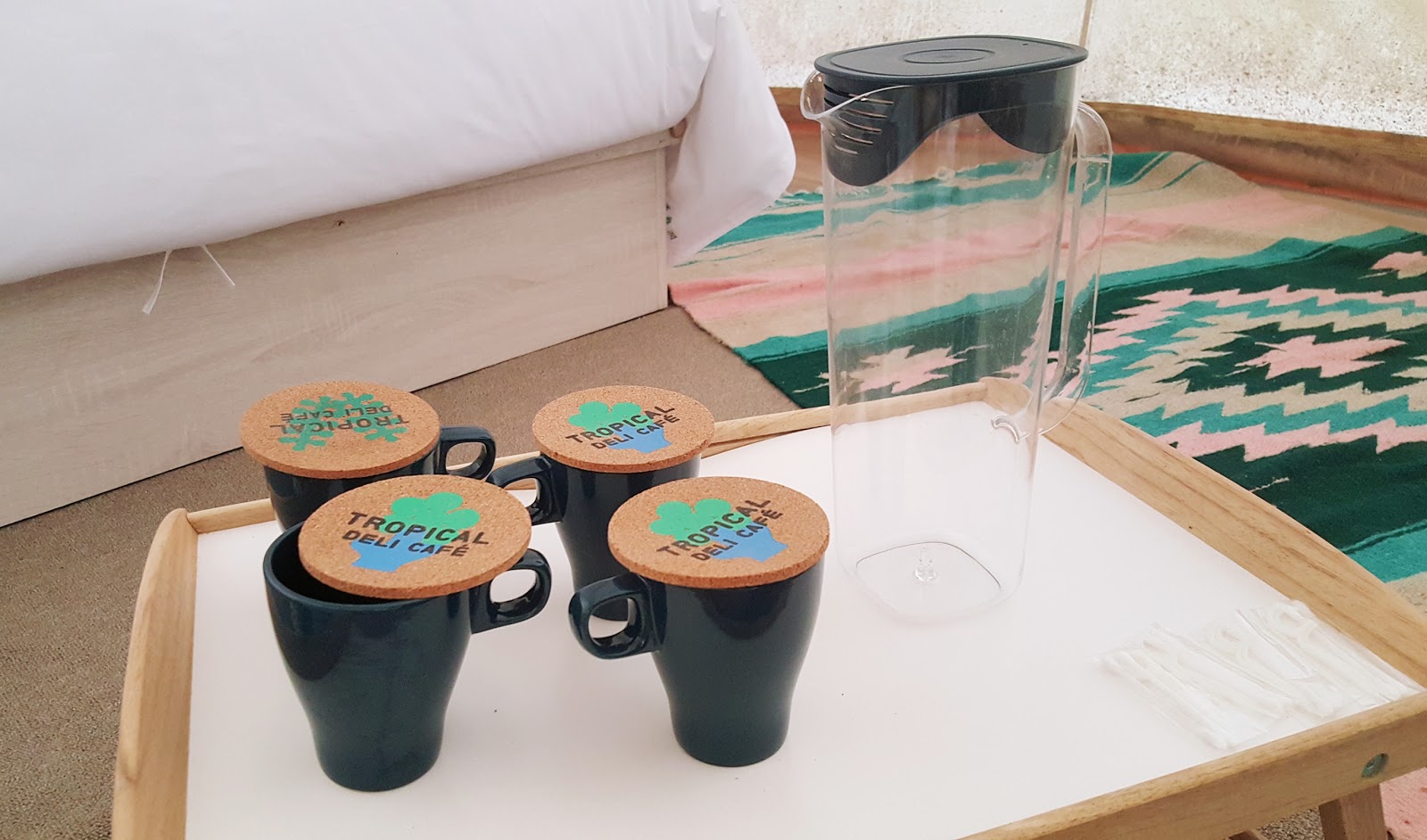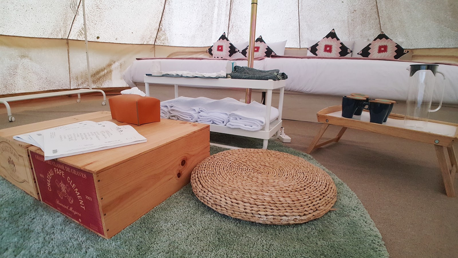 前方空間擺了柔和的地毯,矮桌和坐墊,想喝杯熱飲,馬克杯也準備好了,桌上還有文藝雜誌。露營不只舒適,還可以這樣優雅文青。