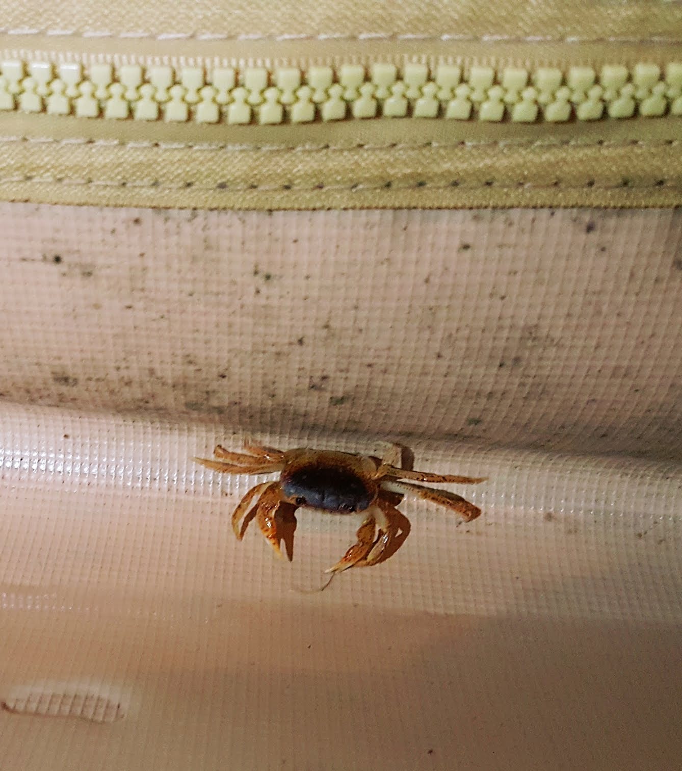 睡覺前要關帳篷的時候,在玄關發現一位迷路的小客人,女兒第一次看到活生生的螃蟹,非常興奮的比手畫腳。然後跟小螃蟹也道過晚安,把牠送出帳篷後,我們在蟬鳴陪伴下進入夢鄉。