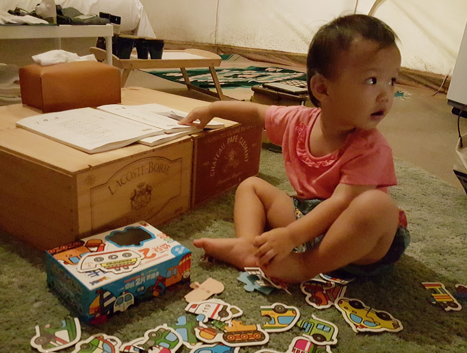 洗完澡後,一家三口舒舒服服的坐在地毯上, 帳篷裡沒有電視,我們專心地享受彼此的陪伴。和另一半聊聊今天好玩的事,和孩子一起玩拼圖,順便培養一下睡意。