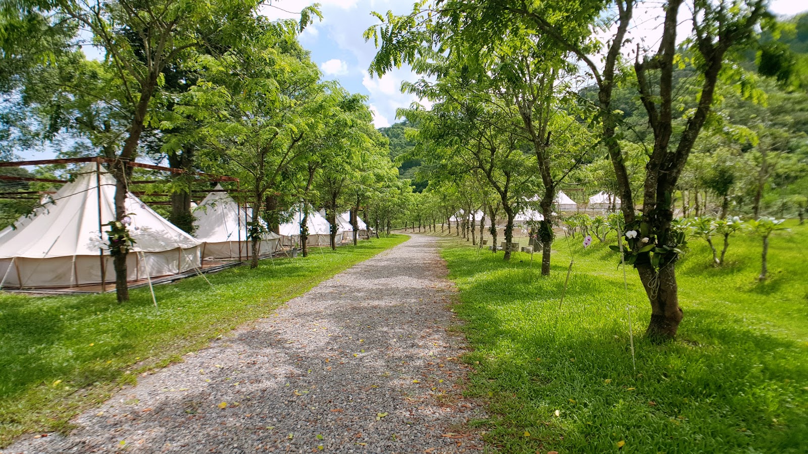 園區道路不複雜,入口處在上圖右手邊。開車沿上方路徑入園,至中間看到服務中心處右轉過橋,即是住宿區停車場。服務中心後方是兩區帳棚區,帳棚區最後方就是麓仰澡堂,有盥洗室和廁所。地圖下方,離入口處不遠上樓梯是溫室餐廳,早晚餐以及在地體驗都會在這裡進行。 大門打開後,映入眼簾的是茵茵樹林及草地,彎曲小徑的設計讓人不會一眼透視整個園區。路面都是鋪設碎石子,而不使用水泥或柏油,是為了方便排水及大型維護機械在園區裡行走。 路旁有許多石桌石椅,走累了可隨意歇腳,也可以自帶食物野餐,晴朗的天氣會有遮陽棚阻隔烈日。