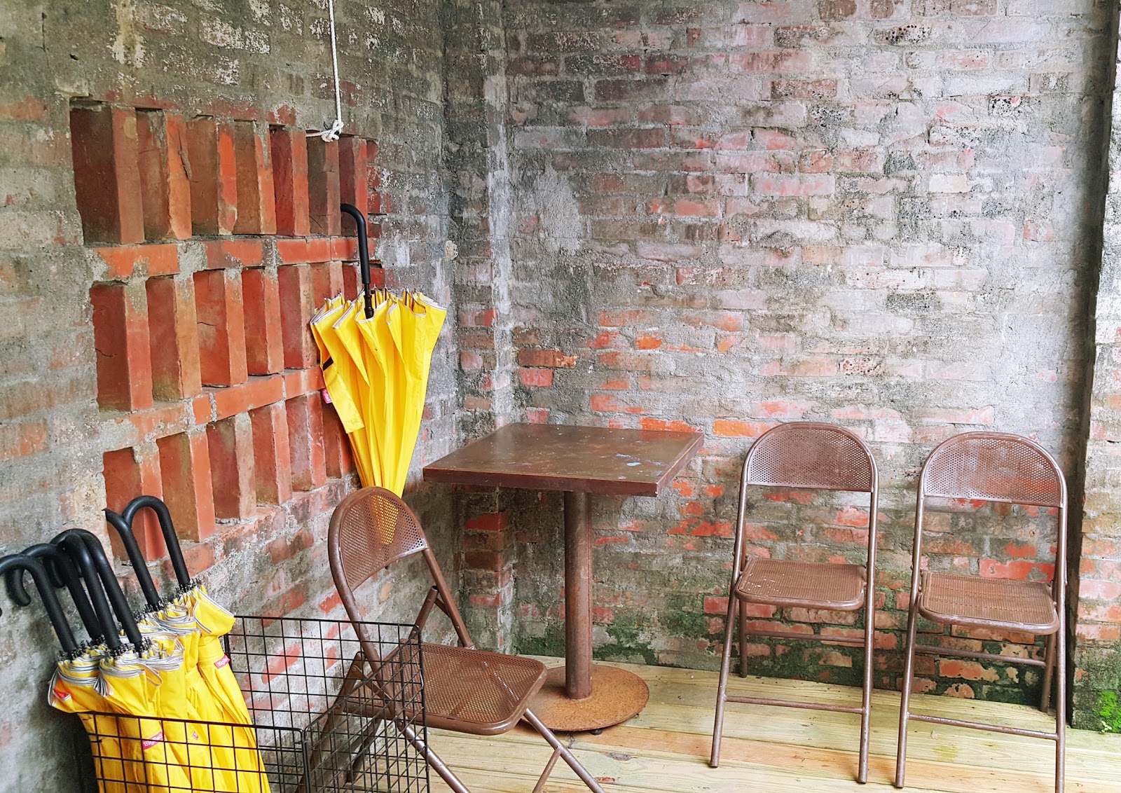 從售票處門簾進來,看到旁邊隨意擺放幾張桌椅,還貼心擺放些雨傘。今年夏天雨水不少,我們到訪的這兩天,時晴時雨,園區幾處都有擺雨傘讓客人使用。