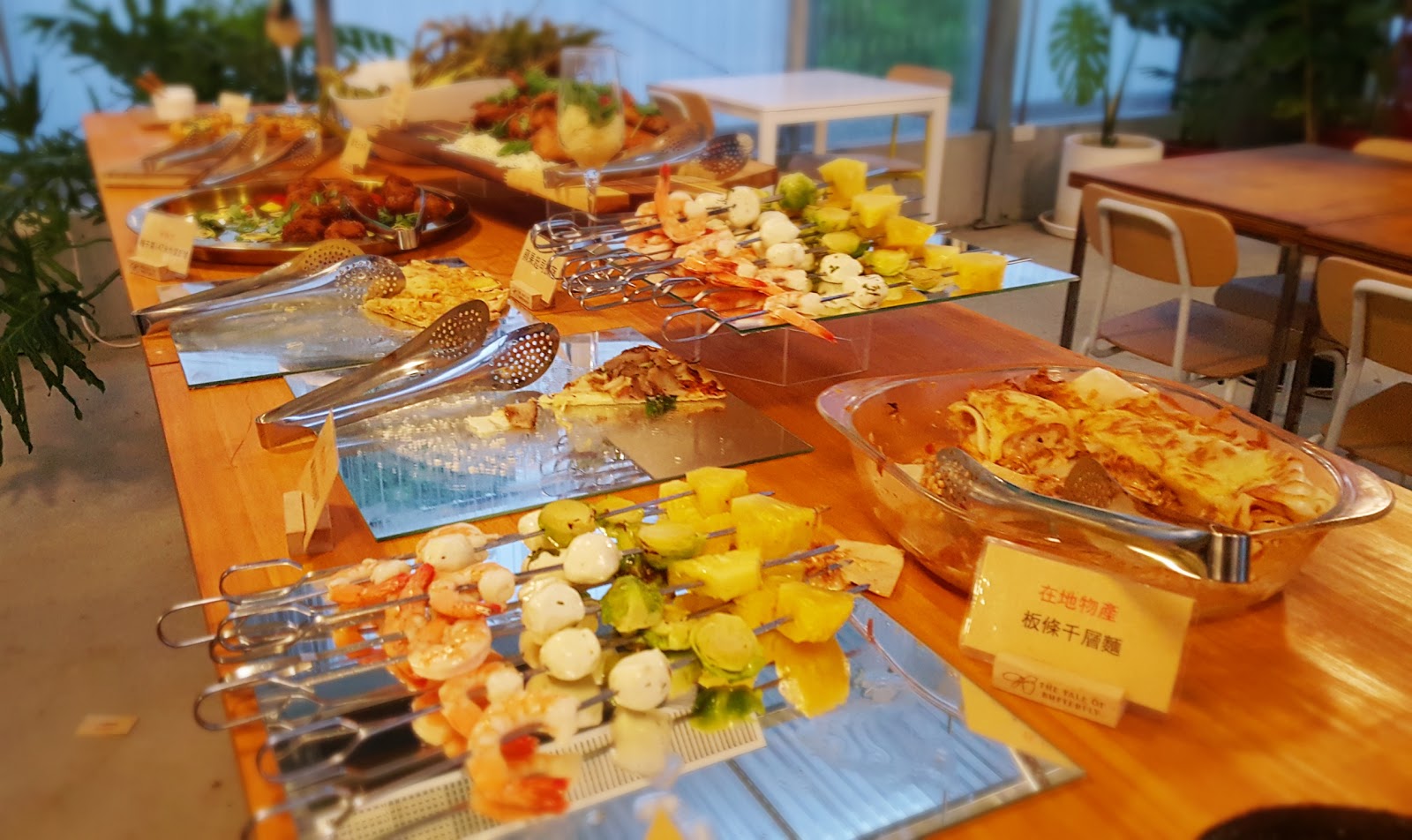 晚餐也在餐廳,當天住宿人數超過20人的話,晚宴是半自助式,有一份肉類主餐,其他的菜餚自助取用。如果低於20人的話就會以套餐的形式提供喔! 滿滿一桌菜,每樣看上去都好誘人,仔細品嚐,發現裡面也是富含在地特色唷!園方真的很用心,將美濃的特產變化各種創意料理,來這裡一趟我才了解,美濃不是只有粄條唷!