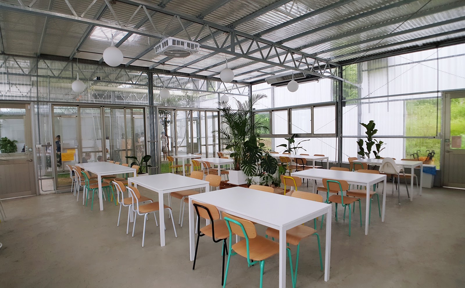 走進建築,溫室餐廳採用大面積的透明玻璃窗,光線充足,白天不太需要開燈。