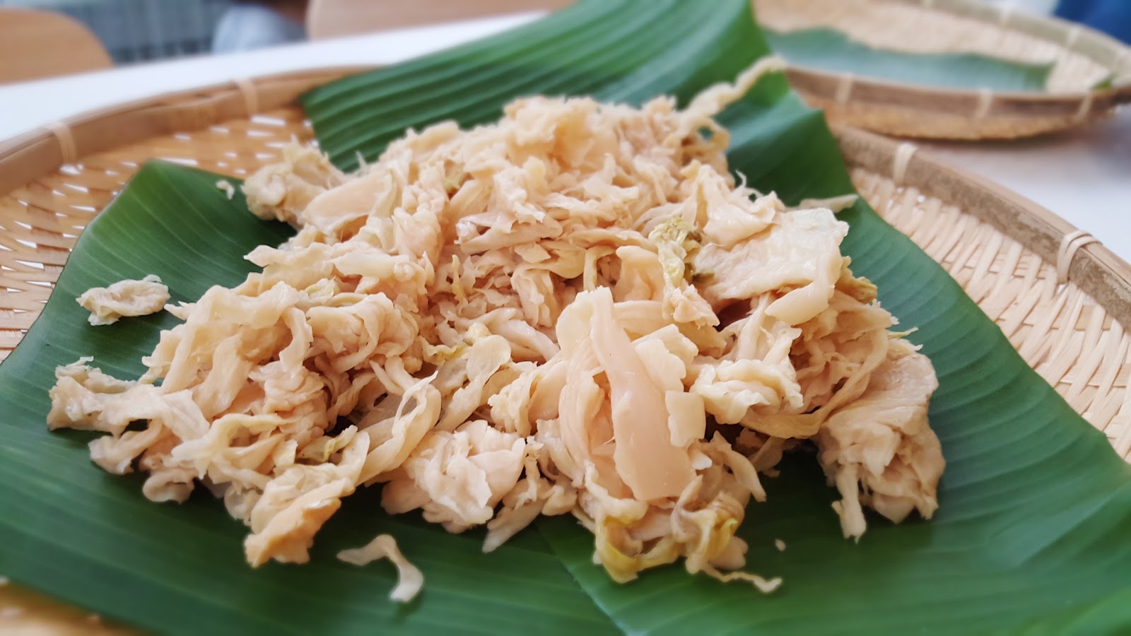 到房間放完行李後,移動到餐廳進行蝶舞澗的特色活動「在地體驗」。今天的主題是「時間的味道」,製作客家高麗菜乾。 講師帶我們認識高麗菜乾在客家文化中的由來和意義。在高麗菜盛產的季節將吃不完的菜,用鹽醃漬去水分,放入酒瓶中發酵,除了可以拉長保存期限,經過時間的巧手還可以醞釀出高麗菜不同的滋味。 經過前置作業的高麗菜,先以鹽破壞細胞壁,脫去水份並曝曬處理。