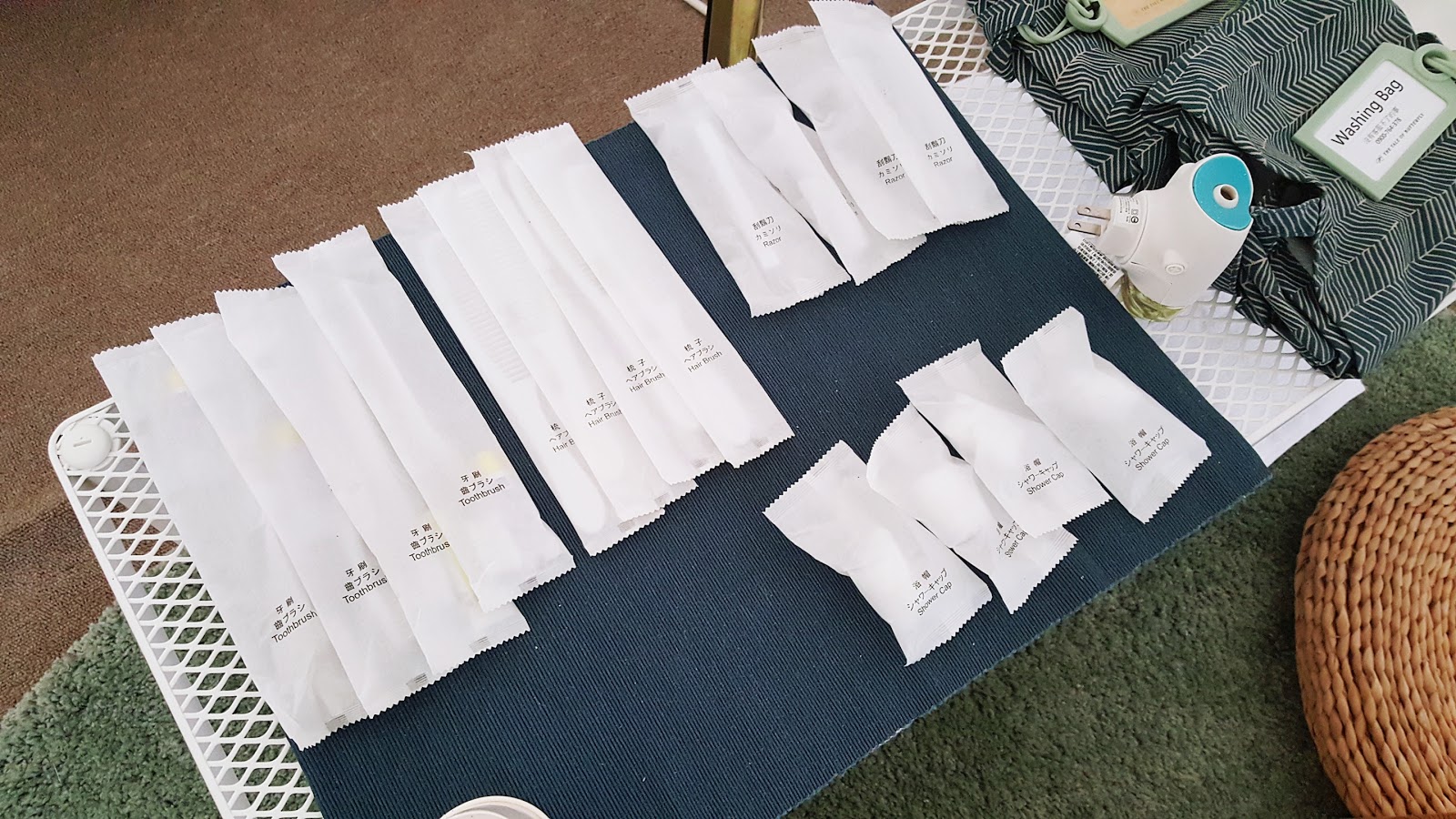 蝶舞澗備有一次性的盥洗用品,不過為了環保我們都自備囉!倒是旁邊的袋子很方便,要洗澡刷牙的時候可以把用品裝進袋子帶去澡堂。